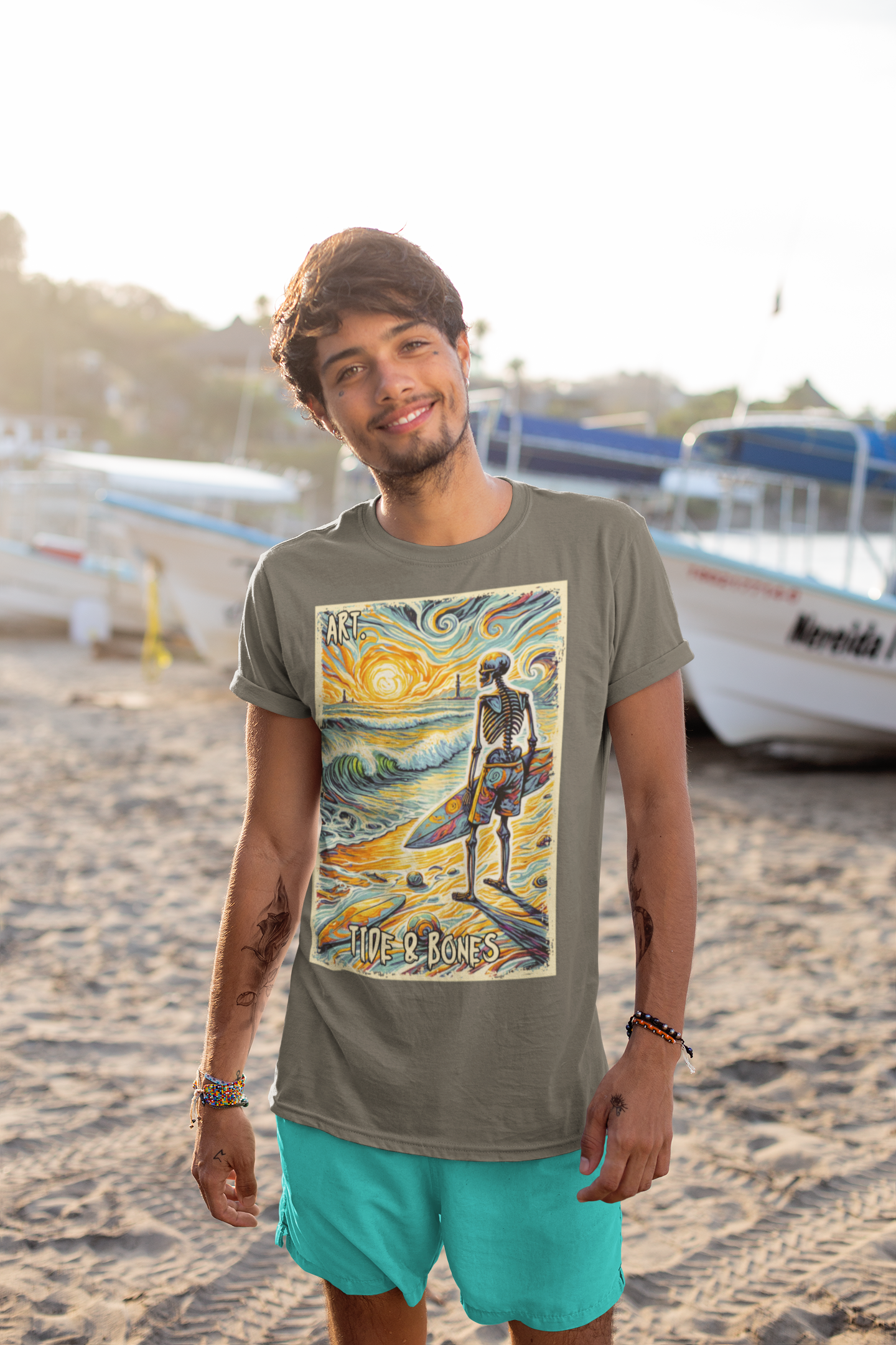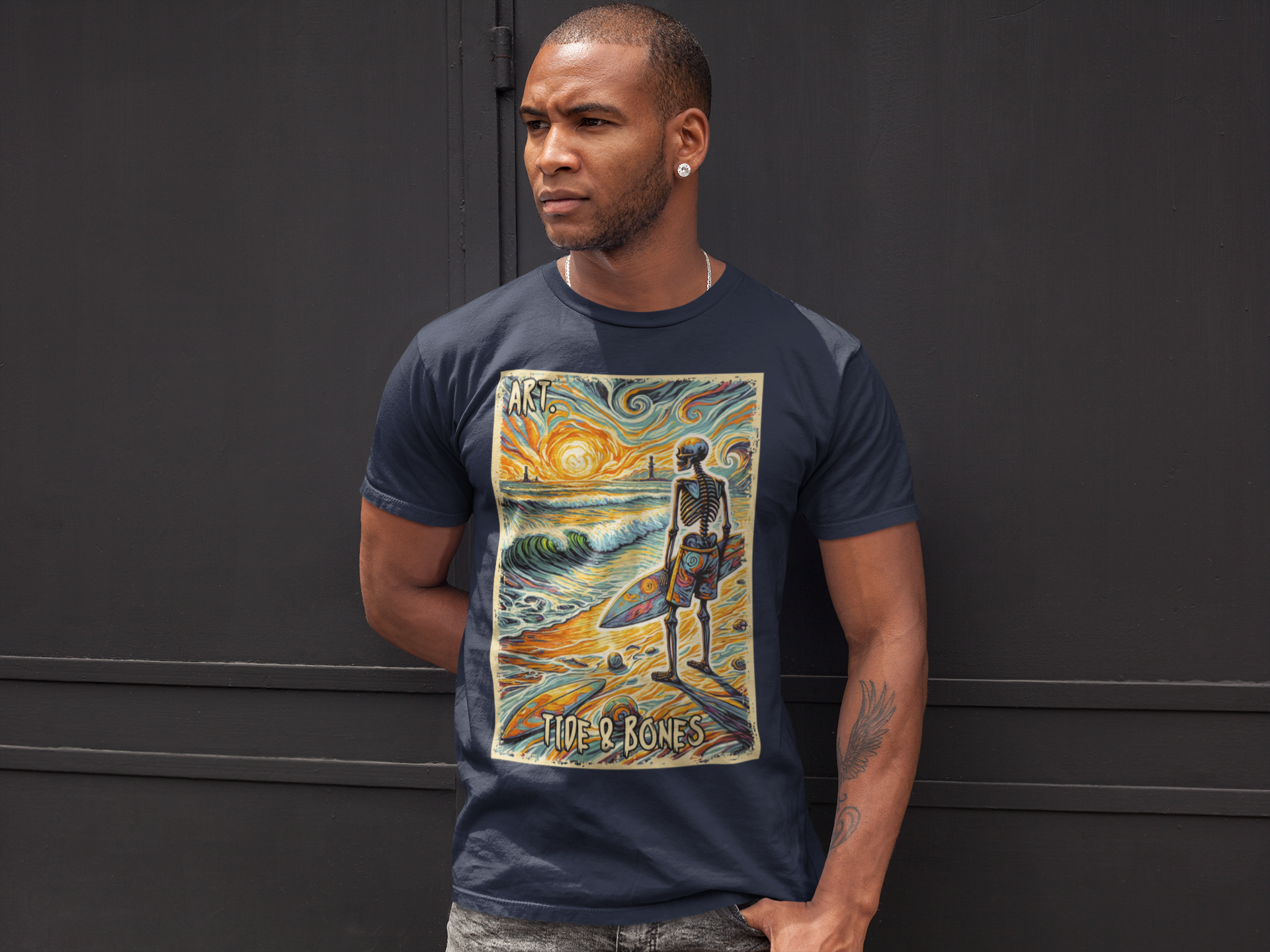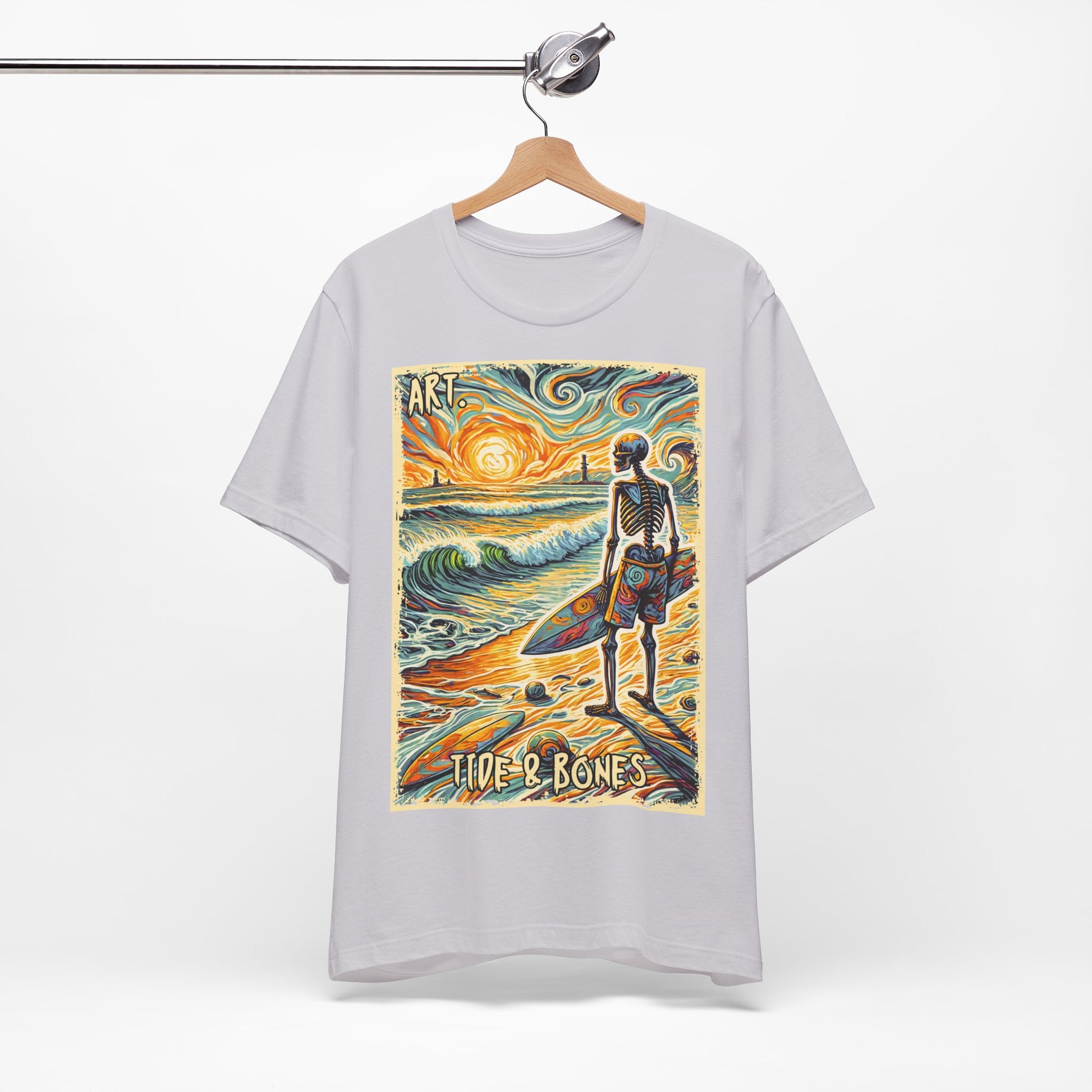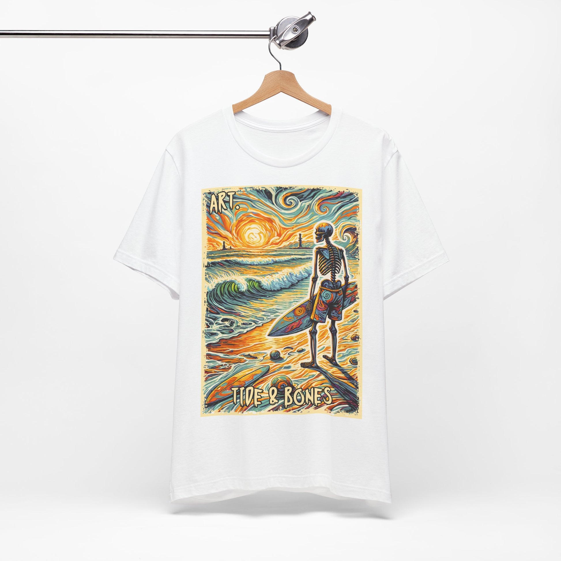 A stunning Sunset Skeleton Art design T-Shirt by Tide & Bones, featuring a skeleton looking out to sea. Very artistic and perfect for those who enjoy unique and edgy designs.