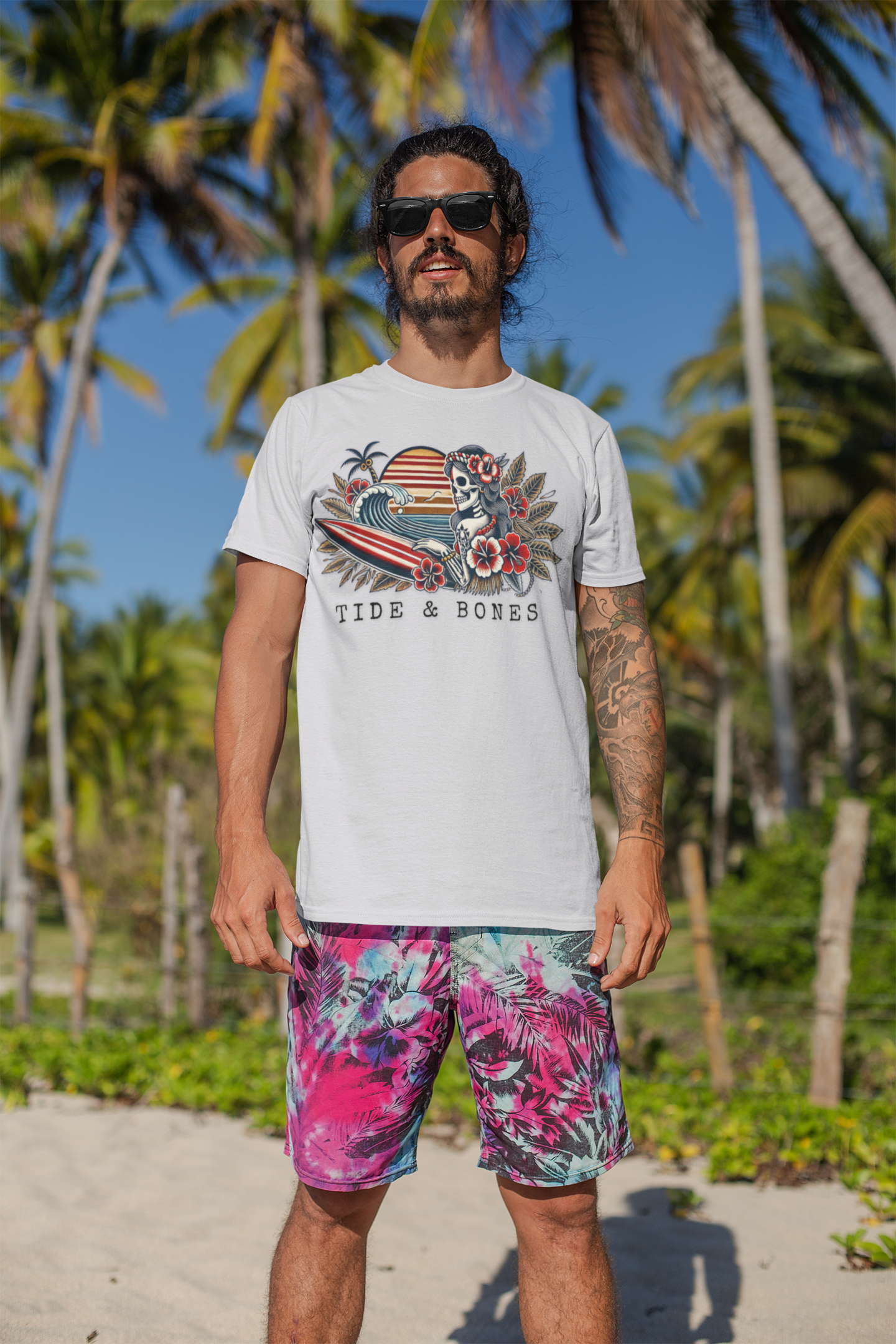A stylish and unique t-shirt featuring a female skeleton surrounded by surfboards, flowers, and the ocean. Perfect for those who love beach vibes and want a standout piece in their wardrobe. Suitable for adults for casual and leisure wear, made with lightweight and breathable 100% Airlume combed and ring-spun cotton. The retail fit and crew neckline add a classic touch, perfect for accessorizing.
