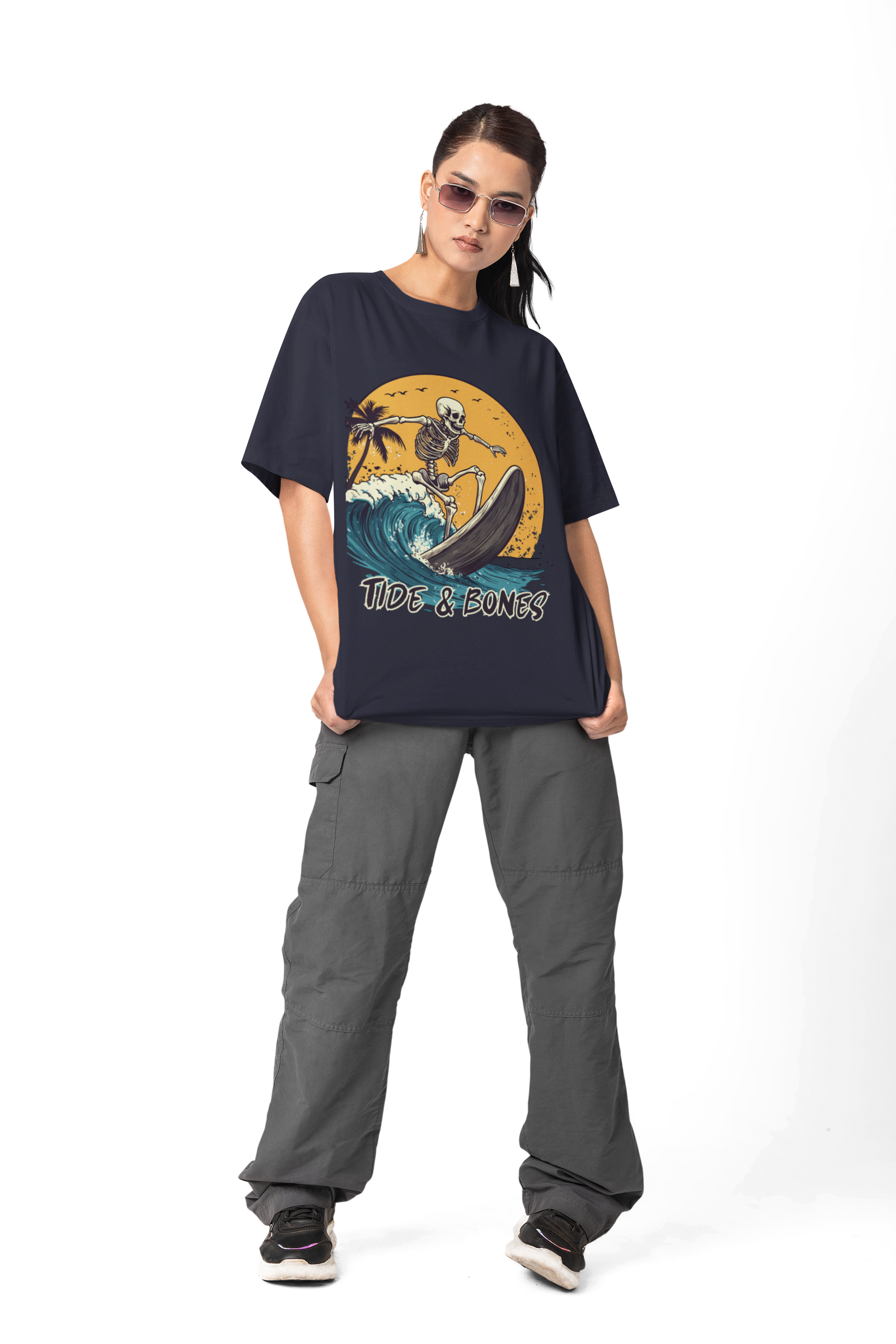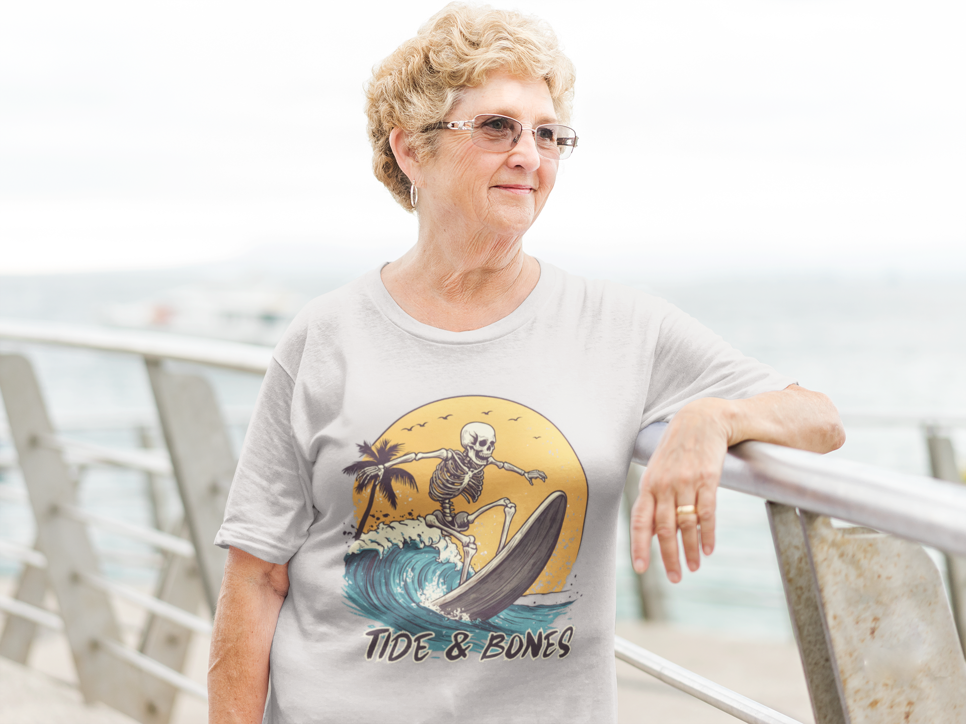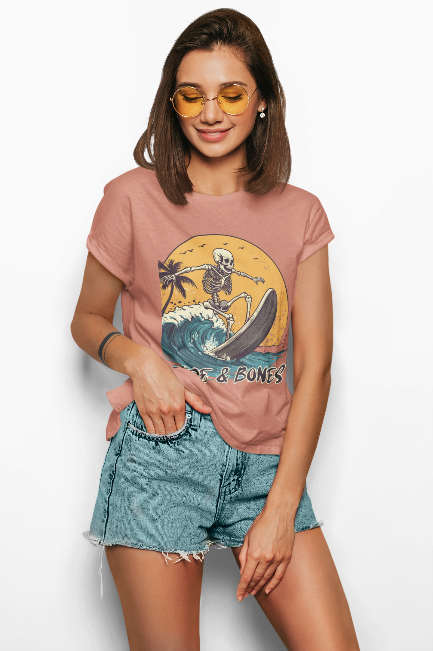 Ride the waves with this surfs up t-shirt by Tide & Bones. An illustration of a skeleton on a yellow backdrop gives off a laid-back vibe.
