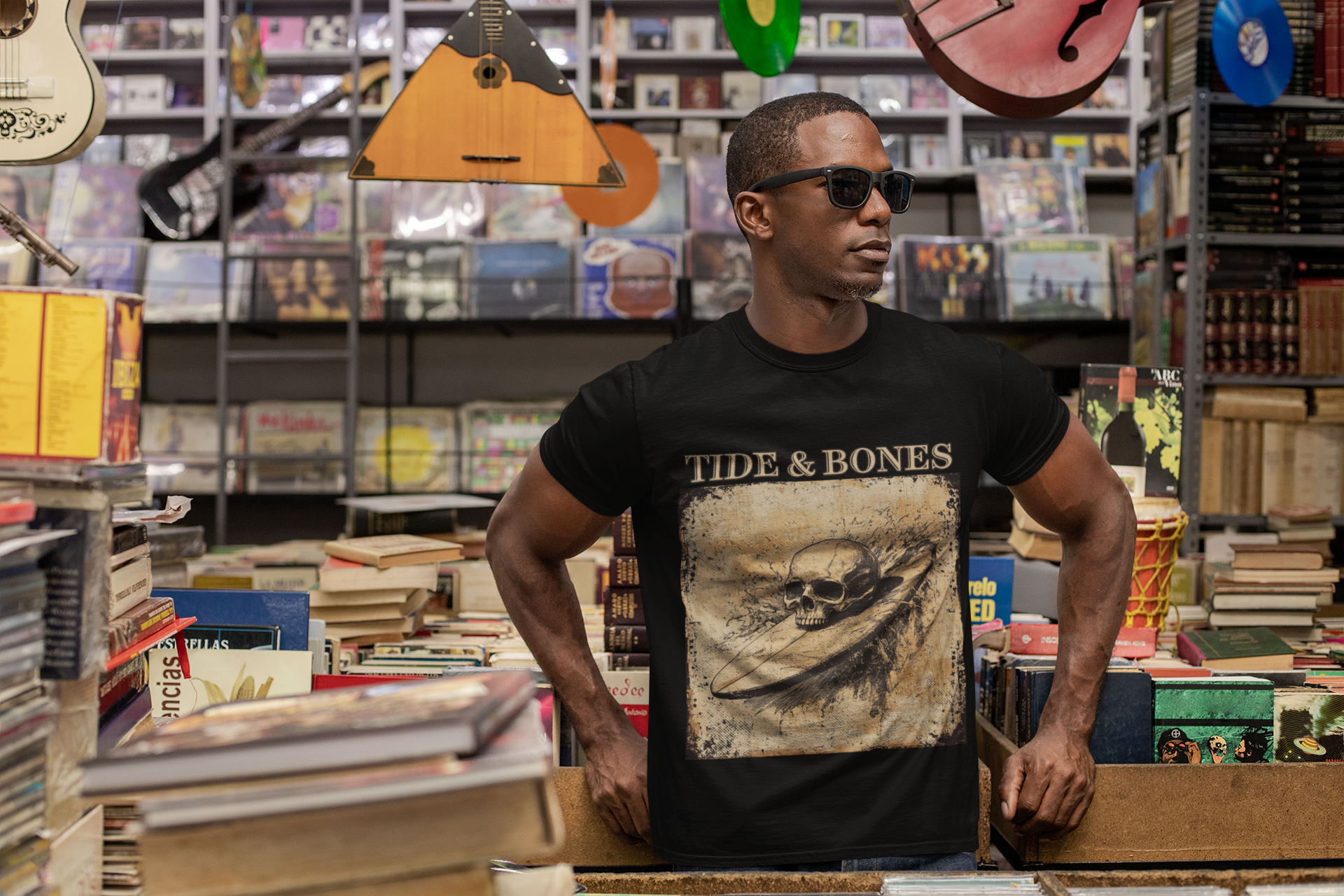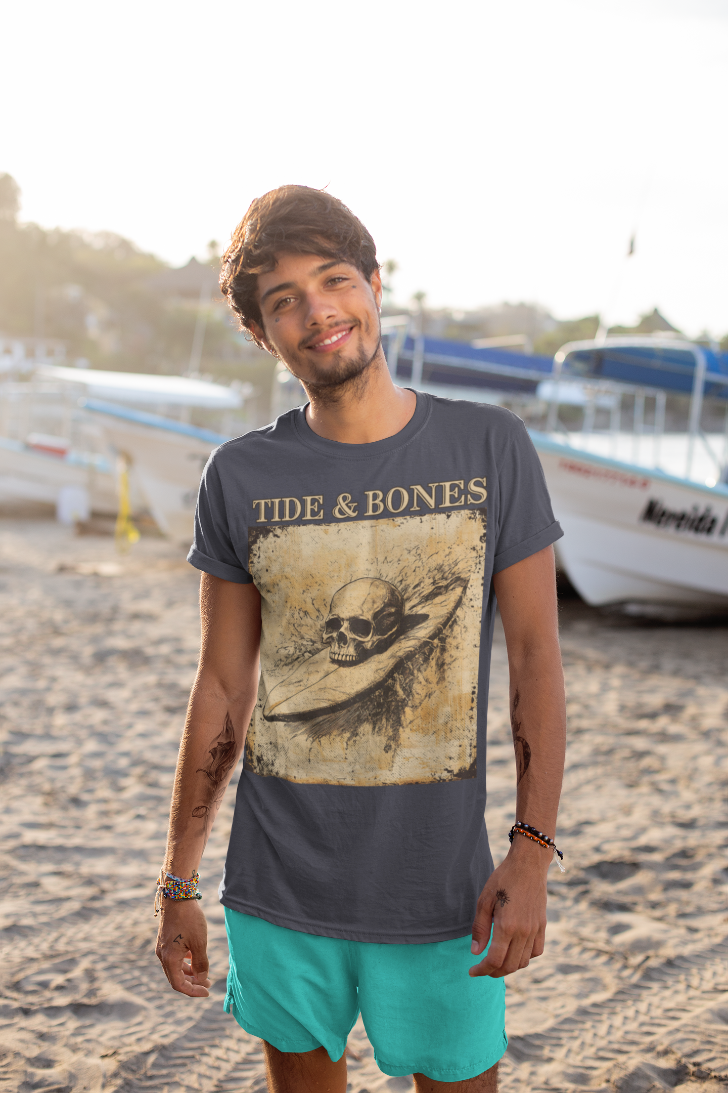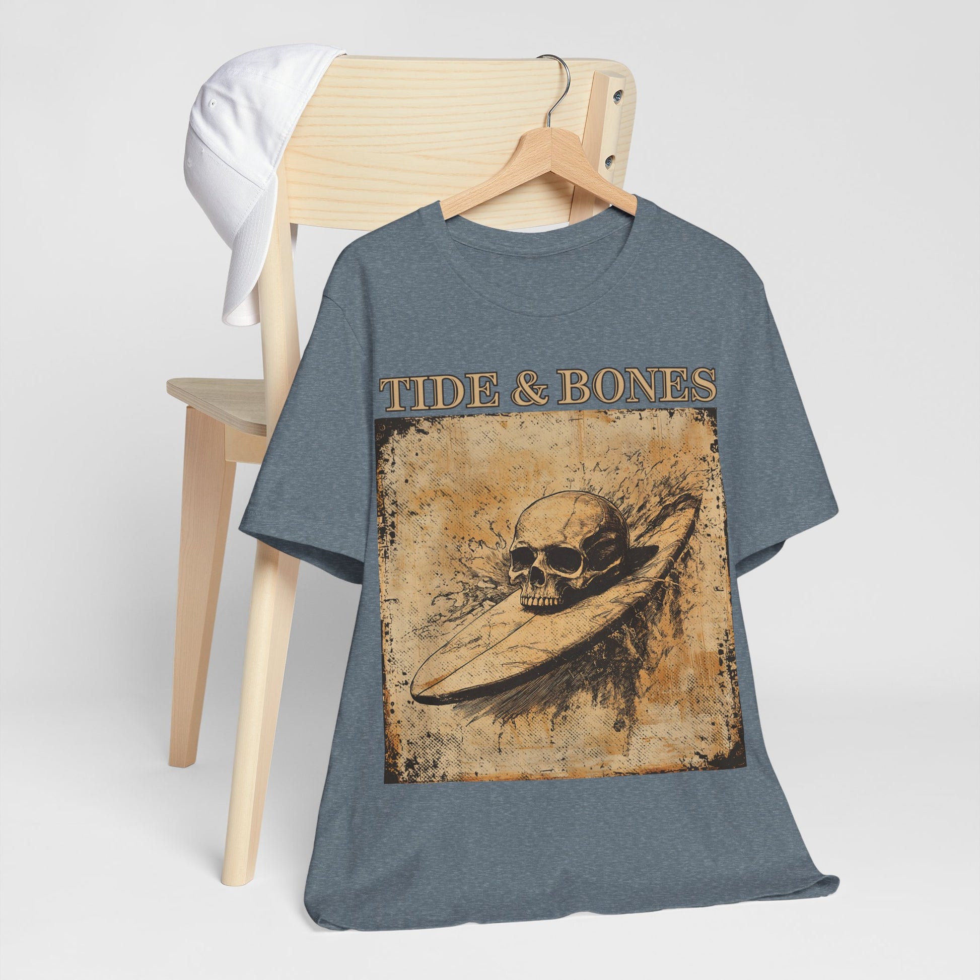 A short sleeve t-shirt featuring a pencil illustration of a skull atop a surfboard.